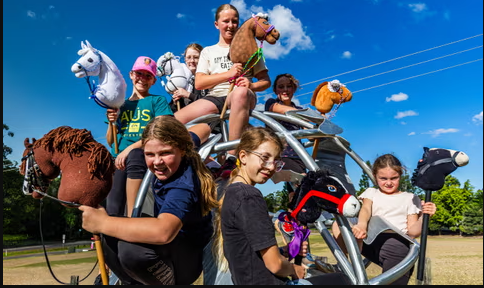 Just like in traditional races, teams compete in timed events while handing off the hobby horse baton.